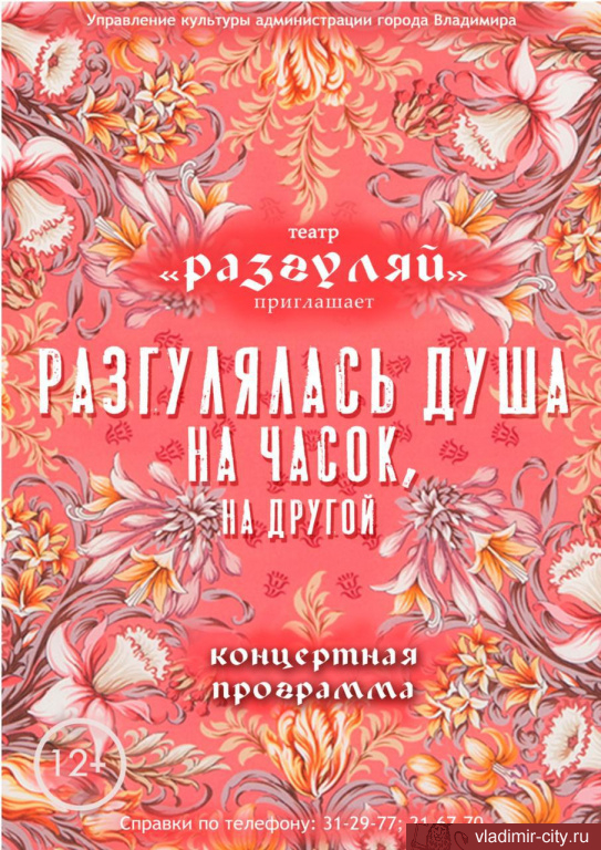 25 августа в 18.00 музыкальный театр «Разгуляй» вновь приглашает жителей и гостей города Владимира на смотовую площадку улицы Георгиевской, где коллектив представит концертную программу «Разгулялась душа на часок, на другой».